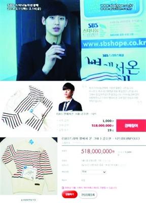 随着SBS电视剧《来自星星的你》的热播,主演金秀贤拿来拍卖的线衫也创下了令人无法想象的价格纪录。在拍卖中播放了他的采访小片,镜头前他表示“我为这次分享拍卖所准备的是线衫。这件线衫是我拍广告时穿过的,希望大家喜欢”。拍卖从11日开始进行,距离截止日期14日还剩下一天,金秀贤的线衫竞拍价格已高达5亿1800万韩元。本次拍卖的最终成交价还将拭目以待。