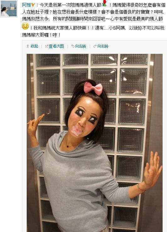 阿雅的微博称:“今天是我第一次陪妈妈过情人节!妈妈觉得很奇妙怎么会有个人在她肚子里?她在想我会长什么模样?会不会是个善良的好宝宝?呵呵,妈妈别想太多,所有的问题让时间来回答吧?心中有爱就是最美的情人节!我和妈妈祝大家情人节快乐!!还有……小S阿姨,以后你不可以叫我妈妈柳大哥咯!哼!”