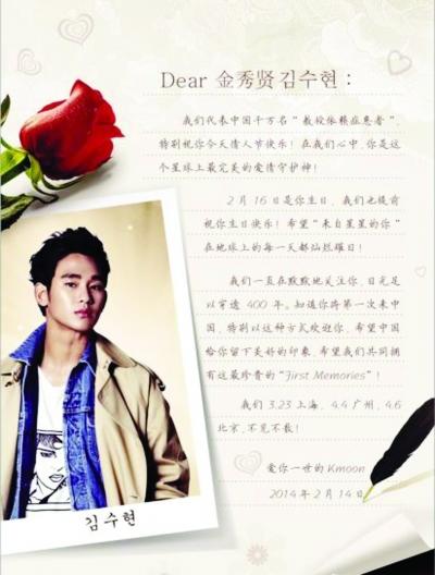 2014年伊始,韩剧《来自星星的你》男主角金秀贤的人气大有超越李敏镐的势头。14日,正当男人们顶着高价玫瑰的压力,将甜蜜爱意纷纷送至各自心中“女神”时,或许他们没有想到,各自的女神却在为另一位男子疯狂——自筹资金在北、上、广的部分纸媒买下大版广告,祝金秀贤2月14日情人节快乐和2月16日生日快乐。但也有人怀疑这就是一场精心策划的炒作。