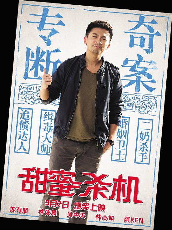 《甜蜜杀机》中集合诸多“囧事”,苏有朋饰演的角色为排遣寂寞靠看“成人片”度日,吴中天“方便”时遭追杀导致尿失禁,林心如痛批苏有朋“头皮屑多”和“肾虚”。苏有朋坦言一直想演一个小人物,让观众忘掉自己的“明星”“偶像”标签,电影中他扮演事业不得志、外表邋遢又胆小的警察,人物有一种“超能力”——遇到危险任务肚子就会“拉警报”。对于这样的颠覆表演,苏有朋笑称自己“越演越歪掉,有点收不回来,但蛮开心的,因为解放自己很不错。”