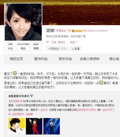 谢娜写道:“看完了一直想说的话,张杰,对不起,从我们在一起的那一天开始,就让你承受了太多的压力误解和攻击。我觉得我好像是一堵无形的墙,让大家看不清真正的你。我知道你内心是难过的,我责备自己也想过离开算了,这样你会不会更快乐一点轻松一点真的!谢谢你的勇敢,让大家看到真正的歌手张杰!”