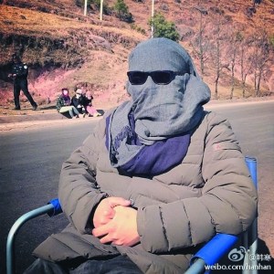 韩寒在微博中写道:“《后会无期》连续的户外拍摄中。我不喜欢往脸上抹东西,终于被晒成了狗。请教大家怎么才能让脸变成一种颜色?”