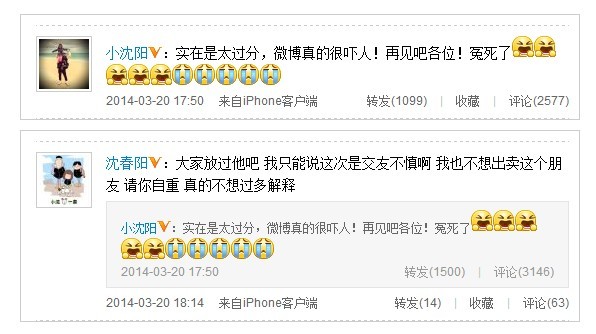 20日下午,小沈阳的微博意外发布了一条含有不雅视频的微博,但很快该微博就被删除。之后他再发文称:“实在是太过分,微博真的很吓人!再见吧各位!冤死了”似乎在撇清与“不雅视频”的关系。