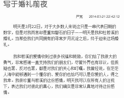 严屹宽和杜若溪交往五年,求婚时严宽就曾发微博表达自己感受。如今两人即将大婚,严宽再次发微博,他说:“我会把我对婚姻的执着、忠诚和勇气凝结成蓝宝石,化作一枚婚戒戴在你的无名指上,告诉你:无论你在外人眼里如何,你是我永远的公主,我掌心里的宝贝。都说穿婚纱是女人最美丽最幸福的时候,我希望能给你一个最好最完美的婚礼,亲手为你设计了一件独一无二的婚纱,纯洁的婚纱将为我们圣洁的婚姻加冕,照顾家庭是我永远的责任,我会为我们的未来努力再努力。”