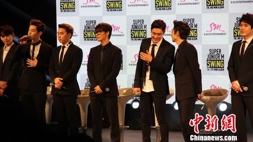 Super Junior-M暌违歌坛许久,今日在北京举行回归记者会,同时也为纪念全新专辑《SWING》的发售。Super Junior-M在中国拥有绝高人气,因活动开始前不时有歌迷结对进场,保安需维持秩序,再加上组合繁重的宣传工作,发布会推迟近1个半小时才开始。