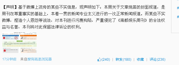 对此,爆料媒体官方微博于4月1日发布声明,称:“基于微博上流传的某些不实信息,现声明如下:本周关于文章姚笛的封面报道,是周刊在尊重事实的基础上,本着一贯的新闻专业主义进行的一次正常新闻报道。而某些不实微博,捏造个人恩怨等说法,对本刊进行污蔑构陷,严重侵犯了《南都娱乐周刊》的合法权益与名誉,本刊将对此保留法律诉讼的权利。”