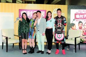 导演卓韵芝带同郑秀文、张家辉、Angelababy和欧豪(从左至右)宣传新片《临时同居》。