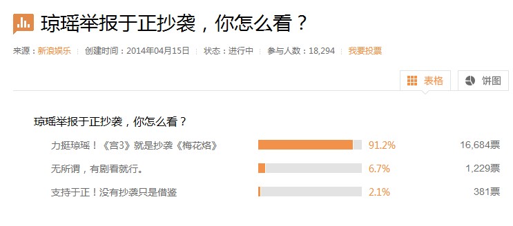 在琼瑶举报于正抄袭的公开信发布后,有网站第一时间发起了关于“琼瑶举报于正抄袭,你怎么看?”的投票,在投票中,支持于正的人寥寥无几,九成以上网友都力挺琼瑶,并认为“《宫3》就是抄袭《梅花烙》”。