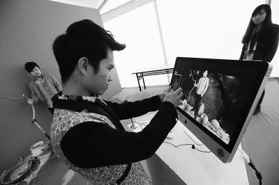 在世纪坛举办的电影嘉年华电影特效展区内,游客站在绿色幕布前与虚拟景色合影。