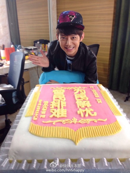 照片中,《快乐大本营》剧组为何炅定制了一款“锦旗”蛋糕,表扬他“为民解忧,替民排难”。而何炅的好友李维嘉、杜海涛、吴昕等也纷纷在微博上,为何炅送上生日祝福。