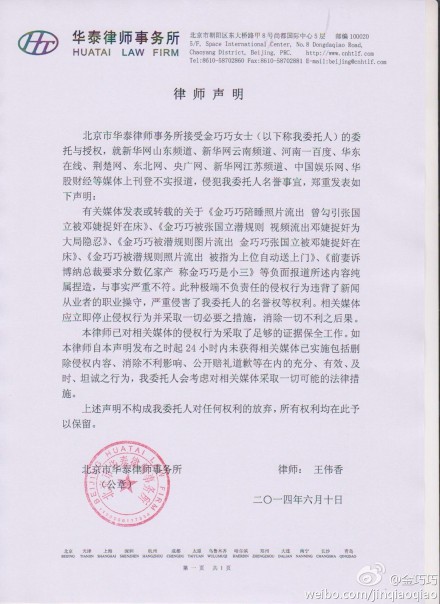 北京市华泰律师事务所接受金巧巧女士(以下称我委托人)的委托与授权,就新华网山东频道、新华网云南频道、河南一百度、华东在线、荆楚网、东北网、央广网、新华网江苏频道、中国娱乐网、华股财经等媒体上刊登不实报道,侵犯我委托人名誉事宜,郑重发表如下声明: