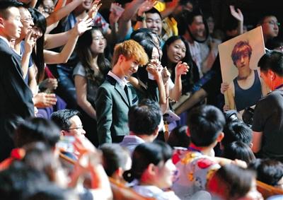 在台上,11位导演和主持人刘仪伟合照(大图)。而在台下,韩寒和郭敬明也是人气王,被粉丝簇拥(小图)。新京报记者 郭延冰 摄