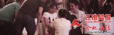 白衣女子冲破“安保防线”,抱住黄晓明,片方工作人员赶忙过去解围。