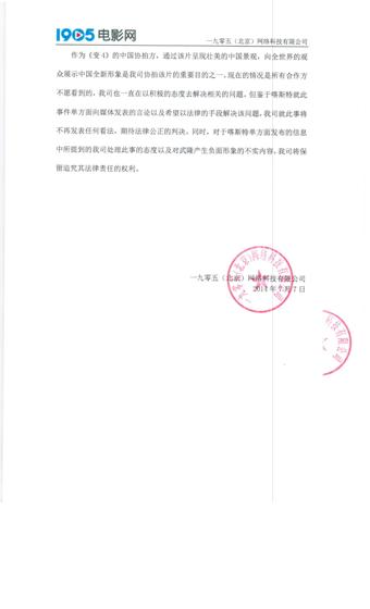 电影网今天还公开了派拉蒙影业公司全球市场营销总裁Nic Crawley的《致武隆的一封信》。信中他提到,在《变形金刚4》中出现的武隆标志是武隆公园里真实的标志。它是在更改显示“中国武隆”之前被用作占位标志牌的,“我们的视频效果公司ILM 告诉我们,他们收到了把这些字改成“中国武隆”的指示,但是没能得到适当的处理”。