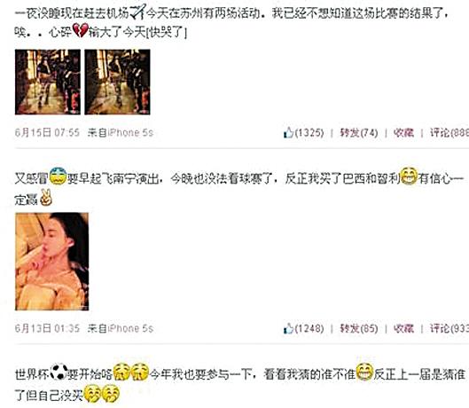 6月11日起,郭美美在其个人微博里多次发布与世界杯相关的内容,其中6月11日微博中表示,自己上届世界杯没有下注,本届要下注。6月13日又写道:又感冒要早起飞南宁演出,今晚也没法看球赛了,反正我买了巴西和智利,有信心一定赢。其后还晒出了下注单,但又删除。两天后她发微博中称自己这次“输大了”。