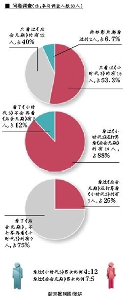 新京报记者昨日在百丽宫影城、国瑞城百老汇影院和卢米埃北京芳草地影城,采访了不同职业和不同年龄的30位观众。在实地问卷调查中,记者发现,30人中只看过《小时代3》的有16人,占总人数的53%;只看过《后会无期》的有12人,占40%,同时看过两部影片的有2人。当观众被问及是否会看另一部片时,88%看了《小时代3》的观众表示会去看《后会无期》,反而在12位看过《后会无期》的观众中只有3位表示如果有闲暇时间可能会去看《小时代3》。