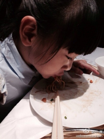 中新网7月26日电 今日,叶一茜在微博晒出一组女儿森碟吃饭的照片,称“她说不能浪费粮食要把面条都吃光,一不留神差点把盘子都给啃了”。照片中,森碟大口吃着面条,一扫而光,表情认真呆萌。此外,叶一茜还称女儿喝水之后“发现味道不对”,并让网友猜是什么水。