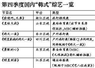 几年前,国内综艺一直是欧美真人秀的天下,无论是湖南卫视模仿《美国偶像》所做的“超快”系列,还是《中国达人秀》《中国好声音》,不过这种情况在去年冬天发生逆转,随着《爸爸去哪儿》第一季的大火,韩式户外真人秀大举攻占荧屏。据记者了解,在第四季度,中国就有不下十档韩式真人秀。其中既有非常知名的《跑男》《两天一夜》,也有在韩国来说都是小众的《艺人住我家》,更有中韩共同制作的《星球大战》《勇敢的心》等。就此,新京报记者采访了《爸爸,我们去哪儿》(简称《爸爸》)的企划黄在焕以及《花样爷爷》等系列的监制黄振宇等韩国业内人士,他们分享了韩国模式成功的制造密码。
