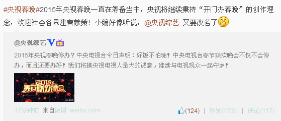 另据央视综艺微博,2015年春晚一直在筹备之中,将继续秉持“开门办春晚”的创作理念,并欢迎社会各界建言献策。