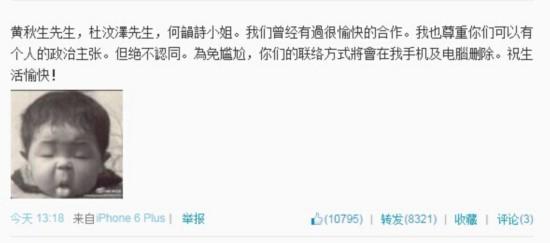 10月16日,香港导演王晶通过微博宣布与黄秋生、杜汶泽和何韵诗绝交,称“黄秋生先生,杜汶泽先生,何韵诗小姐。我们曾经有过很愉快的合作。我也尊重你们可以有个人的政治主张。但绝不认同。为免尴尬,你们的联络方式将会在我手机及电脑删除。祝生活愉快!”(吴亚雄)