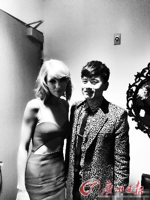AMA有关人员称,在他们心中,张杰很红,就是中国的泰勒·斯威夫特。图为张杰在微博中晒出的其与泰勒·斯威夫特在全美音乐奖后台的合影。