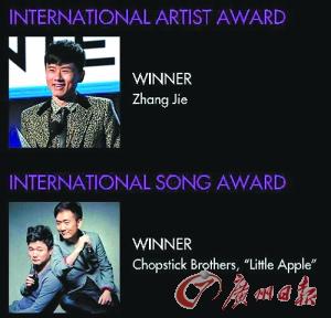 而对于张杰与筷子兄弟获得的 “国际艺人奖” (International Artist Award)及“国际歌曲奖”(International Song Award) 到底是什么样的奖的问题,对方回应:这是从今年起特别设立的官方奖项,以后每年都会有。