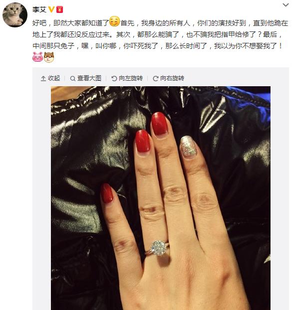 李艾晒钻戒承认被求婚 娇嗔:以为你不想娶我(图)