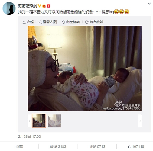 照片中,范玮琪戴着帽子,靠床头坐着,双腿拱起,一个宝宝被其抱在怀里,另一个则靠着妈妈大腿安睡。对此,她留言“找到一种不费力又可以同时顾两只熊猫的姿势,得意”。