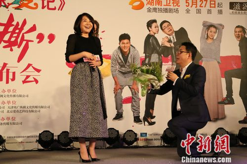 中新网北京5月25日电(鲍文玉) 今日下午,都市喜剧《前夫求爱记》在北京举行开播发布会,导演尚敬,编剧徐君东,主演闫妮、高亚麟、大左、佟悦、李舒桐纷纷现身。现场,因戏结缘的佟悦和李舒桐公开恋情,佟悦还当众向女友求婚。而高亚麟则在众人起哄下,即兴上演“猩猩秀”,并拿西兰花向闫妮“求婚”。