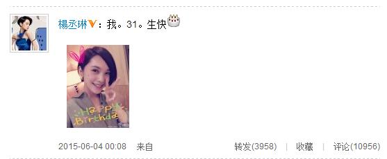 中新网6月4日电 今日零点,李荣浩在微博写道:“生日快乐。”随后,杨丞琳则在微博晒出庆生照,称:“我。31。生快。”照片中,杨丞琳比出剪刀手,并给自己画上一个蝴蝶结,笑容灿烂。
