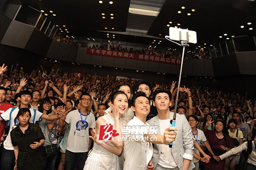 今日,首执导筒的何炅携新片《栀子花开》主演张慧雯、宋轶、柴格、王佑硕在湖南大学举行校园见面会。虽然长沙下着大雨,出行十分不便,但是会场外的学生已经排成了“长龙”准备入场。入场后,学生们的热情更是差点把屋顶掀翻。