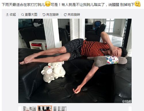 中新网北京6月16日电 今日中午,陆毅通过微博晒出一组自己在沙发靠背上睡觉的照片,并留言称,“下雨天最适合在家打打盹儿。可是!有人就是不让我盹儿踏实了,说醒醒,别掉地下”。