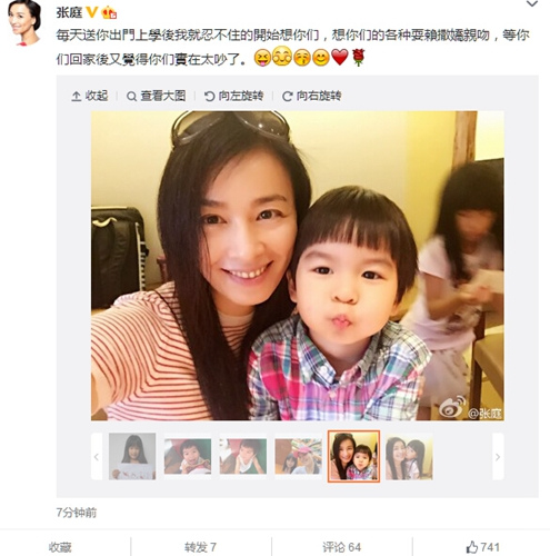 张庭分享母亲甜蜜心情 送儿女上学后想念他们(图)