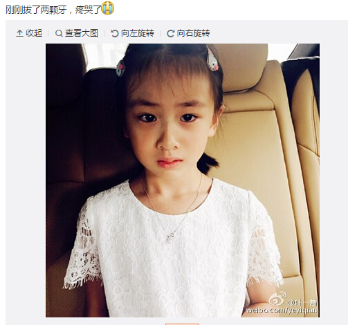 中新网7月29日电 今日中午,叶一茜在微博晒出一组女儿森碟拔牙的照片,并留言称,“刚刚拔了两颗牙,疼哭了”。