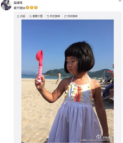 照片中,吴速玲身穿蓝色长裙,女儿Grace身穿白色裙子与妈妈站在一起,短发造型清爽可爱;此外,还有Grace伸手欲抓水桶、Joe赤裸上身在沙滩玩耍的照片。