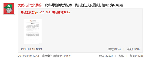 随后,被指侵权的新浪微博用户“关爱八卦成长协会”转发了该声明,并表示“此声明堪称优秀范本!供其他艺人及团队仔细研究学习哈哈!”