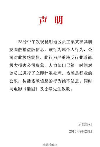 随后,乐视影业在官方微博上发表声明,称发现公司昆明地区员工粟某在朋友圈散播《港囧》盗版信息,该行为属于个人行为,公司对其极感震惊。并表示已将该员工辞退,同时向《港囧》和徐峥道歉。