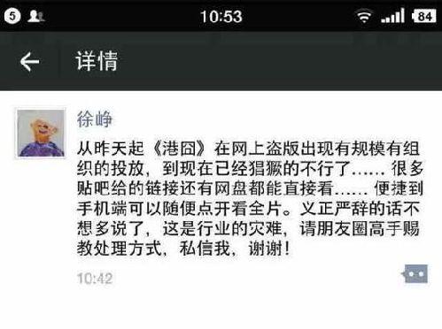 今日导演徐峥在朋友圈发文控诉《港囧》在网上出现盗版:“从昨天起《港囧》在网上盗版出现有规模有组织的投放,到现在已经猖獗到不行,很多贴吧给的链接还有网盘都能直接看,便捷到手机端可以随便点开看全片。”并表示:“义正言辞的话不想多说了,这是行业的灾难。”