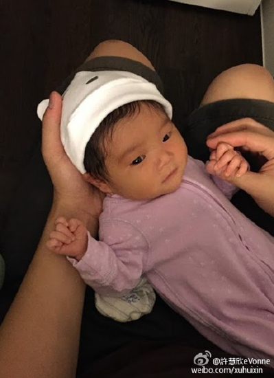 今日,许慧欣在微博晒出与女儿的合影,并称:“我现在相信一见钟情了!产前阵痛了超过25个小时。baby e决定出生在我们的结婚纪念日10月6日晚上,让那个日子更加幸福。她很健康,是很标准的,肤色健康红红的头发很长!除了老公还有妹妹(通过视频)和两位妈妈们陪在我身边迎接baby e。同学问我,知道你的心现在活在你体外有什么感觉?就是很奇妙!”