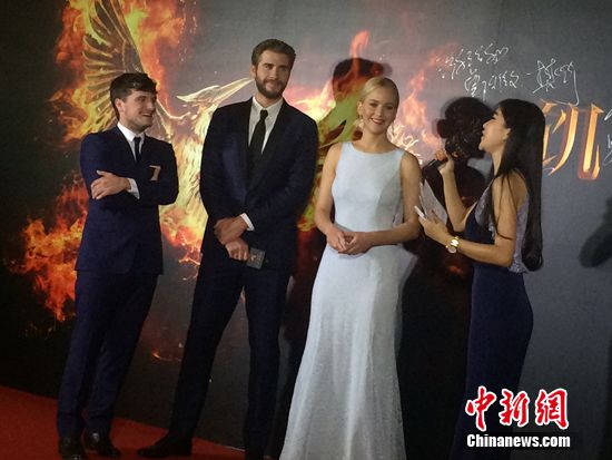 乔什·哈切森(左)、利亚姆·海姆斯沃斯(左二)、詹尼弗·劳伦斯(右二)