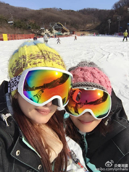 秦海璐刘涛滑雪玩自拍 眼罩遮脸面带微笑(图)