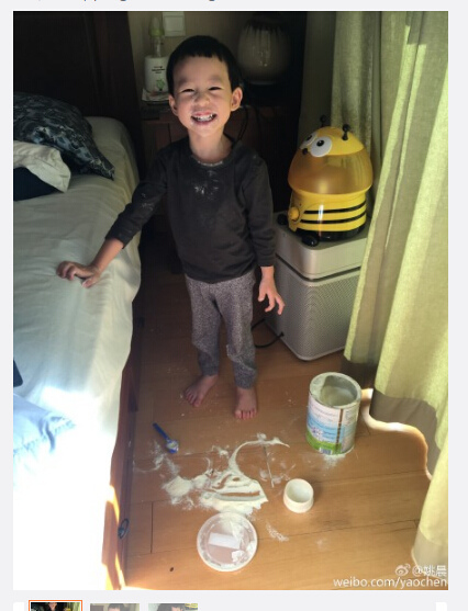中新网1月13日电 今日下午,姚晨通过微博晒出多张爱子“小土豆”将一桶奶粉打翻的萌照,并留言称:“朋友,干了这杯奶粉!”