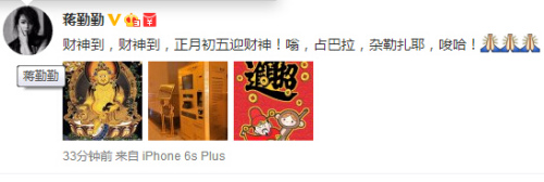蒋勤勤发文称:“财神到,财神到,正月初五迎财神!嗡,占巴拉,杂勒扎耶,唆哈!”李静分享财神图片,并称:“初五接財神,顺风又顺水”。林心如也写道:“接财神,迎喜气,祝福大家如心如意如春风。”