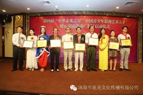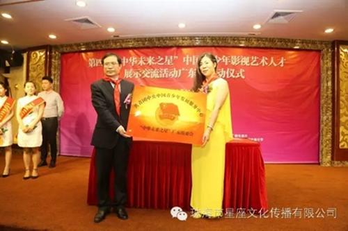 共青团中央“中华未来之星”中国青少年影视艺术人才交流活动全国组委会秘书长陈香先生授牌于珠海市星座文化传播有限公司为共青团中央中国青少年发展服务中心“中华未来之星”广东组委会并现场签约合影