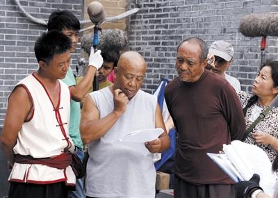 吴天明导演(中)在拍摄现场指导陶泽如(右)等演员表演。