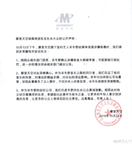 中新网10月14日电 民谣歌手宋冬野昨日因涉毒被北京警方抓获。今日,宋冬野经纪公司发布公开声明,称代表宋冬野向社会公众真诚致歉。希望能以此事作为前车之鉴,让更多年轻人意识到涉毒危害,也让更多公众人物承担起社会责任。远离毒品,珍爱人生!