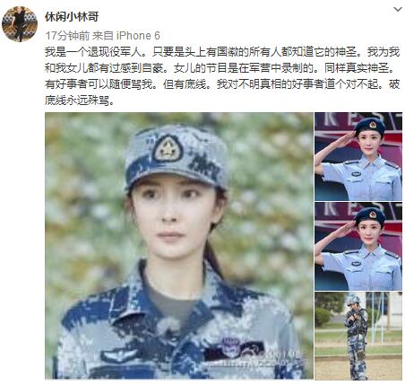 今天他又发文回应这次争吵,称“我是一个退现役军人。只要是头上有国徽的所有人都知道它的神圣。我为我和我女儿都有过感到自豪。女儿的节目是在军营中录制的。同样真实神圣。有好事者可以随便骂我。但有底线。我对不明真相的好事者道个对不起。破底线永远殊骂。”