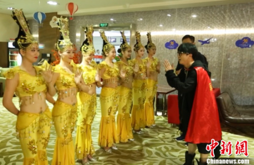 在登机前,节目组安排了一场精彩的千手观音表演,找到红包就有机会免费升级为商务舱。听到这个好消息的薛之谦随手把包扔在地上,说“我要开始认真了”。两个人全程目不转睛死死盯着美女们手上的红包,看的入迷,害怕一眨眼就把红包跟丢了。直愣愣看着红包的眼神十足的“财迷”样子,耿直boy薛之谦曾坦诚说自己上综艺就是为了赚钱做音乐,上期化身为“日进斗金”太阳神,看到100块就笑的合不拢嘴,这一次的红包更是不能错过。