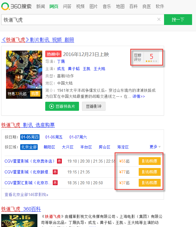 搜索当下热映的《铁道飞虎》,360搜索页面上,除了豆瓣的评分、预告片,还会有影城的入口,甚至连票价对比信息、放映时段等选座购票信息都一览无余,可谓是相当贴心。点击影讯/购票,就能直接进入格瓦拉的购票页面,相当便捷。