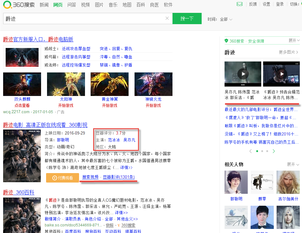 在360网页搜索页面上,搜索“爵迹”就能看到3.7的豆瓣评分,还可以直接进入豆瓣影评查看具体评论;在侧边栏有爵迹的花絮和最新的评论文章,最新评论显示,和《爵迹》相比,《摆渡人》才是更烂的片子。